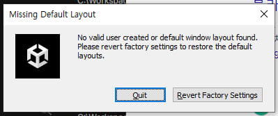 Unity Editor를 열면서 참조하는 것처럼 보이는 Default window layout을 찾지 못했다는 내용입니다. 공장 초기화 셋팅(Factory Settings)로 복구(Restore)해서 기본 레이아웃으로 돌릴건지, 종료할 건지를 묻는 내용.