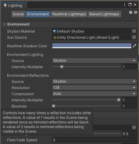 Lighting 설정 창에서 Lightmapping Settings 헤더 아래에 Indirect Intensity 값을 0 이상으로.