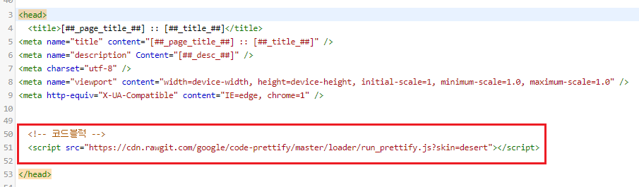 3. 제일 뒤, "/run_prettify.js" 뒤에 "?skin=desert"" 부분의 desert 가 스킨입니다. 아래 링크에서 맘에 드는 스킨 골라서 수정하시면 됩니다.
