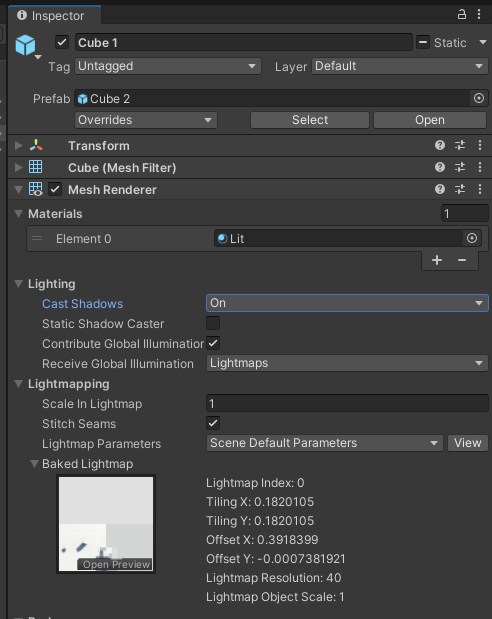 Lighting/Contribute Global Illumination 체크. Receive Global Illumination 은 Lightmaps 설정.