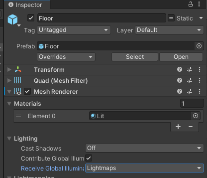 2. 바닥 물체의 MeshRenerer 에서 Lighting/Contribute Global Illumination 체크.
