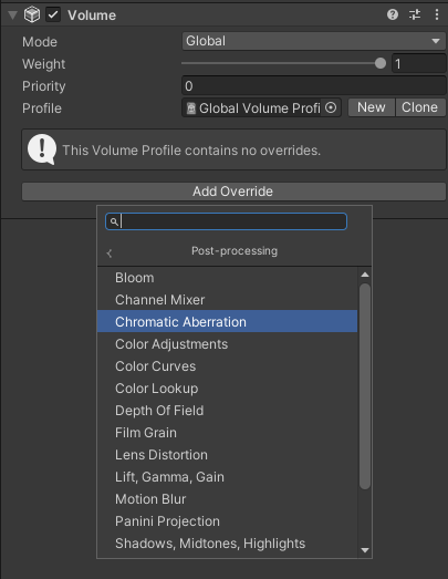 Profile 하단에 Add Override 버튼 클릭하고 후처리 효과 선택.
