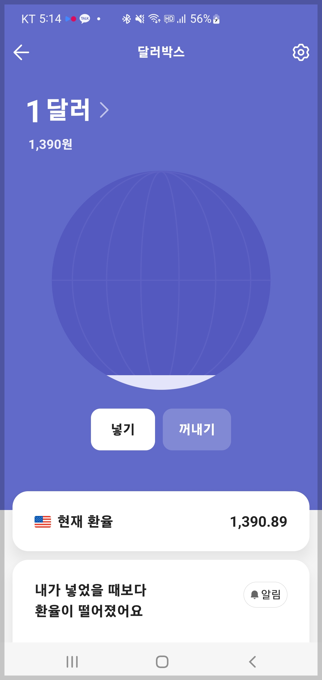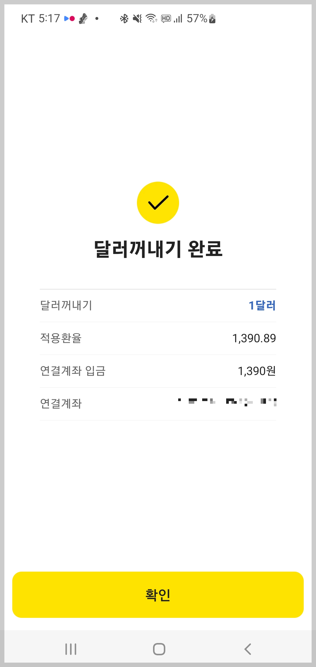 다시 달러박스로 이동하면, 1달러가 정말 들어와있네요. 현 시점 환율은 1390원. 환전 수수료도 무료라고 하니 바로 달러 > 원화 환전을 해줍니다. 달러 꺼내기가 완료되면, 연결 계좌로 1390원이 들어옵니다.