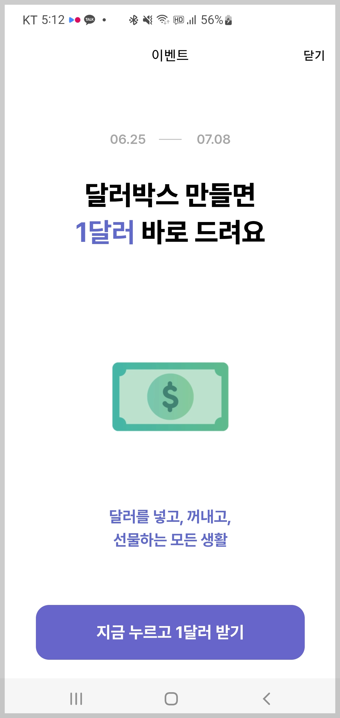 이렇게, 달러박스 가입해서 환전 수수료 0원인 서비스도 활용해보고 1달러도 줍줍해봤습니다. 이벤트 기간 중에 1달러, 1390원 줍줍 하시길.