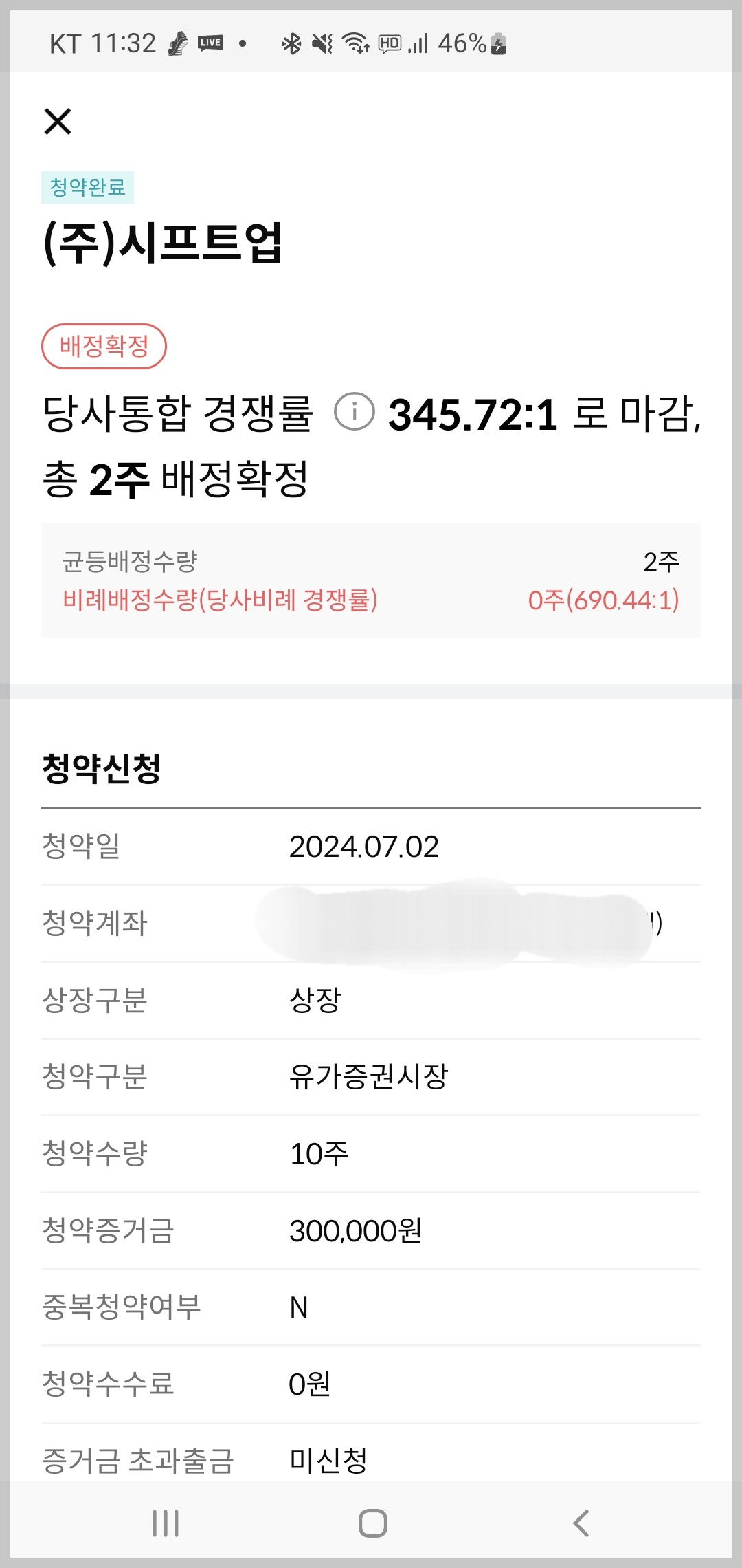 증거금도 최소로 넣었는데 경쟁률도 높아서 잘 해도 1주 정도 배정 받기를 기대했는데, 운이 좋게 2주를 배정 받았습니다. 지인 중에는 4주를 배정받는 분도 계시더군요. 원리는 잘 모르겠지만, 어쨌든 좀 랜덤인가봅니다. 여기서도 게임 가챠가...