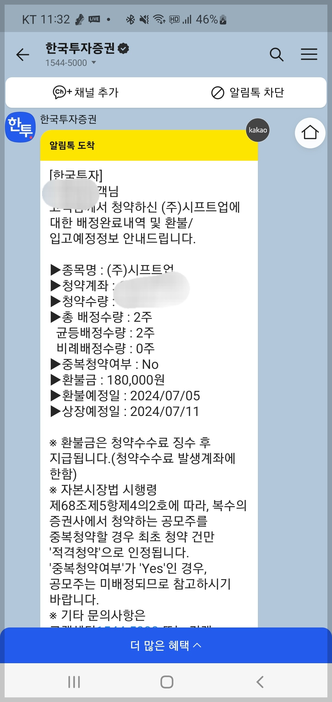 아무튼, 공모가 6만원짜리 주식 2주를 배정 받아서 증거금 30만원 중 12만원을 지불하고 18만원은 환급을 받게 됐습니다. 환급은 오늘인 7월 5일에 입금을 해준다고 합니다.