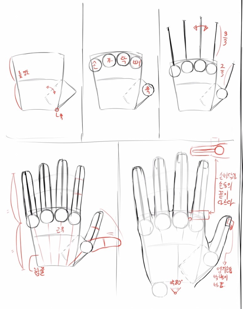 손은 손가락만 신경쓰다보면 손가락 관절을 대충 그리는 경우가 많은데, 손가락 관절부까지 3부분으로 나눠서 생각하면 좀 더 자연스러운 손이 나오는 것 같습니다.