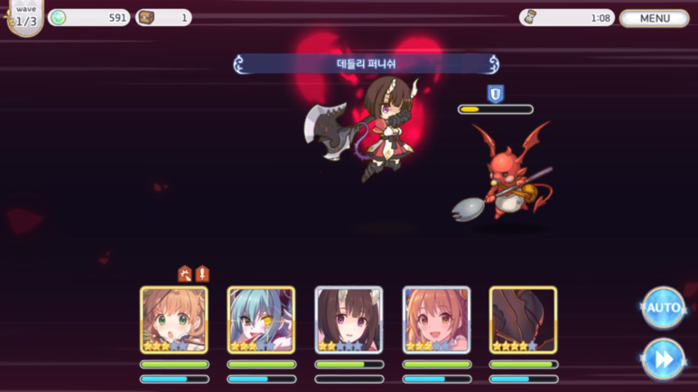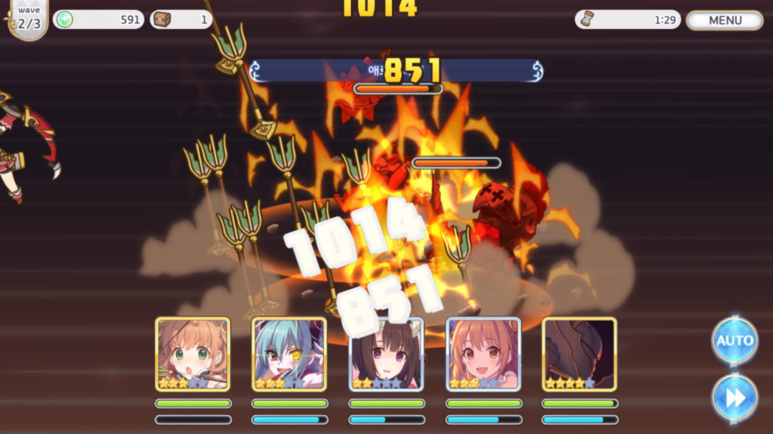 이런 구성. 도탑과의 큰 차이는, 캐릭터들이 귀엽다는 것. 스킬을 사용할 때 컷신도 애니메이션 퀄리티로 아주 잘 뽑았습니다. 계속 보면 시간효율이 떨어지니 보통 끄게 되는 것 같지만요. 신캐를 얻으면 한 번쯤 봐주는 정도?