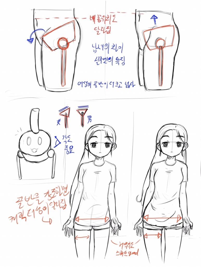 골반의 특징에 대해 그렸습니다. 밥그릇 모양의 골반과 그 각도, 크기에 따라 캐릭터성이 크게 변할 수 있다는 내용이었습니다.