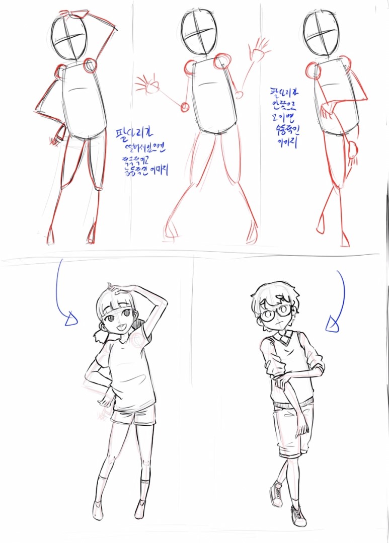 팔다리의 포즈에 따라 캐릭터의 이미지를 표현하기 좋습니다. 능동적이고 적극적인 포즈, 수동적이고 내성적인 포즈 등 여러가지가 있을 수 있을 것 같습니다.