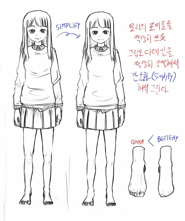 음식 요리에 조미료를 적당히 쓰듯, 그림도 디테일을 적당히 조절해가면서 간소하 시킬 부분은 간소화 시키면서 그려줍니다. 특히 발은 간소화 하는 경우가 많지만, 그리는법을 알고 간소화 해야지, 잘 모르기 때문에 뭉게는 식으로 그리지 않도록 잘 파악해야 겠습니다.