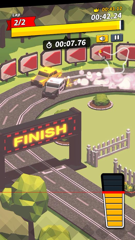다양한 트렉에서 다양한 자동차를 조종하며 스테이지를 클리어하는 방식으로 진행됩니다. 성장요소는 크게 없어서 과금을 유도한다거나 하는 식의 플레이를 강제로 막아버리는 장치는 보이지 않습니다. 단지 게임오버를 여러차례 당했을 때 광고팝업이 뜨는 정도. 썩 재밌는 게임 중간에 광고가 뜨는 정도는 이제 자연스러운 흐름이 된 것 같네요.