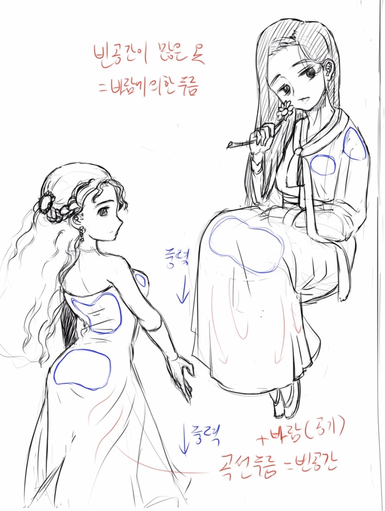 치마와 같이 몸에 닿지 않고 빈 공간이 많이 생기는 옷은 바람에 의해 생기는 옷주름에 대해 신경써서 그립니다.