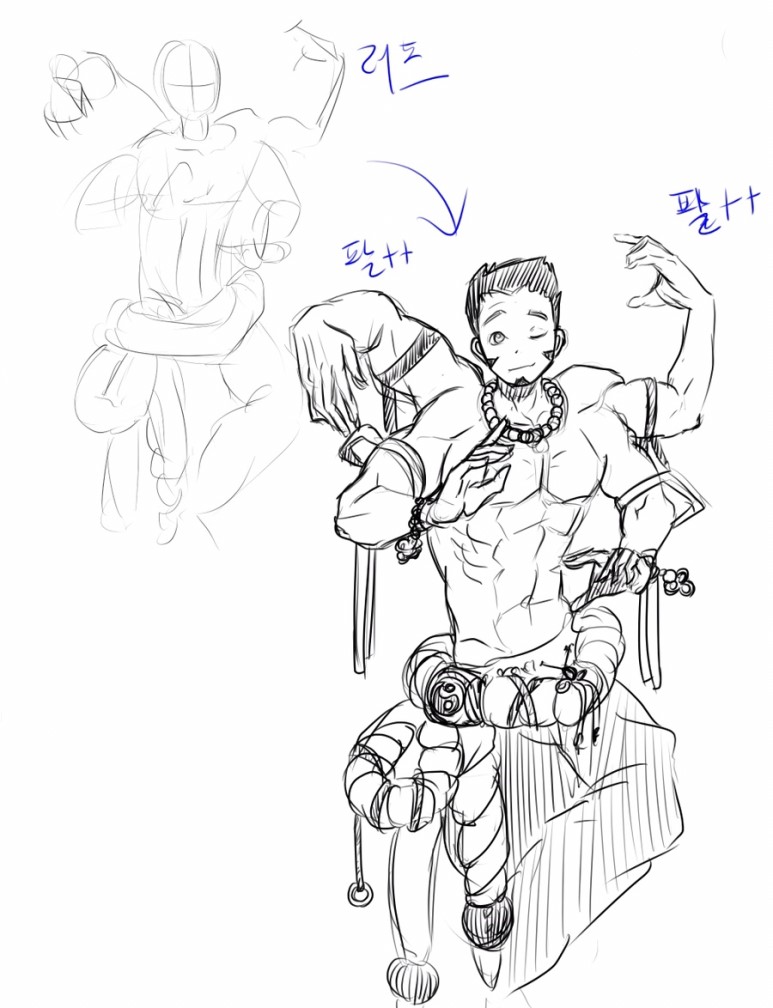 위 예제는 팔이 4개인 캐릭터. 특수부위는 상상으로 그려야 하는 경우가 대부분이기 때문에 자칫 굉장히 어색해보일 수 있어서 그럴싸하게 그리는 것이 중요합니다. 이 챕터에선 그런 내용들을 다룹니다.