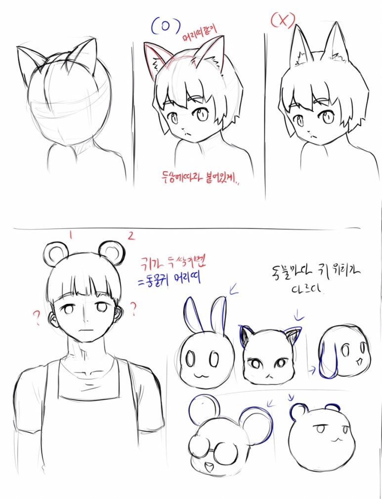 두상의 입체감을 따라 동물 귀를 붙이는 식으로 디자인 할 수 있습니다. 수인 캐릭터를 그린다면 중요할 법한 부분이네요.