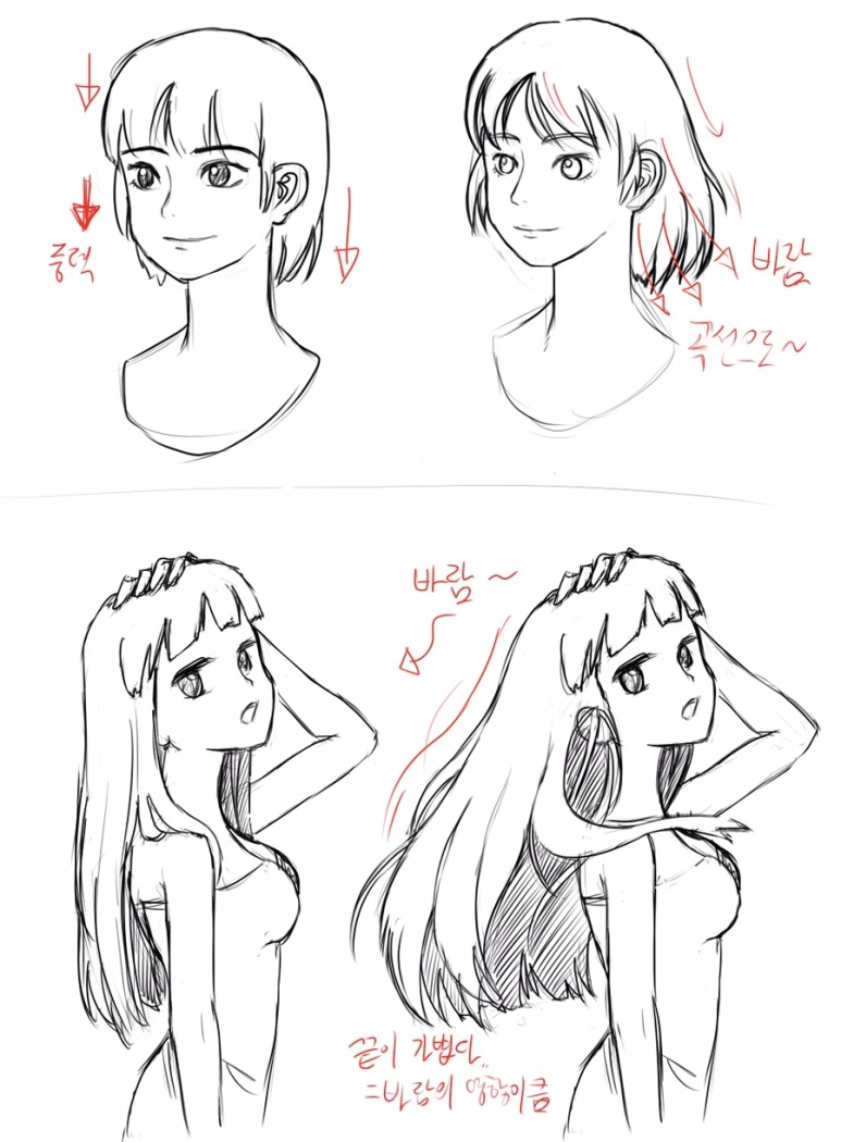 머리카락으로 만들어지는 실루엣에 대해 공부했습니다. 머리카락은 끝부분이 상대적으로 가벼운 재질(?)이라 바람의 영향을 받아 풍성한 실루엣을 만들어냅니다. 자칫 단조로워질 수 있는 캐릭터의 실루엣을 디자인하는 데 활용하기 좋은 것 중 하나가 머리카락이니, 역시 다양하게 많이 보고 참고하면 좋을 것 같습니다.