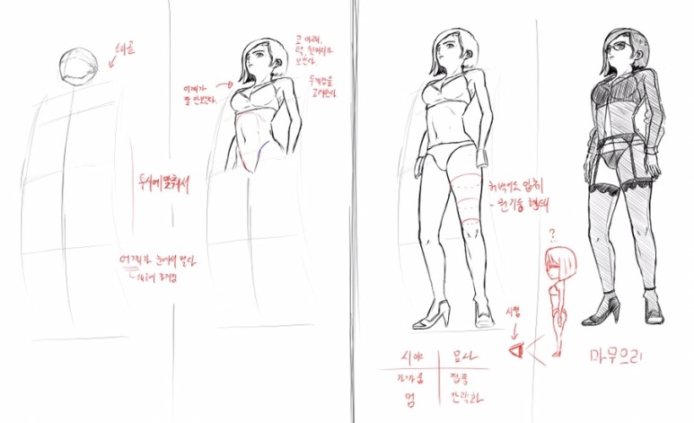 인체 투시 그리기 과정 두 번째. 이번엔 로우앵글입니다.