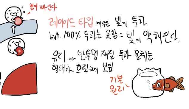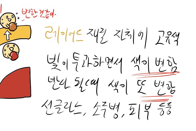 빛이 사물을 투과한 뒤 반사되어 나올 때의 색 변화에 대해 그렸습니다.