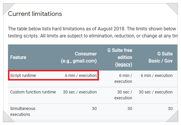 스크립트 실행 한 건의 시간 제한이 걸려있습니다. 큰 데이터를 처리하다보면 시간이 오래 걸릴 수 있는데, Google Script 에서는 한 번의 Execute Time 을 6min 으로 제한을 걸어두었습니다.