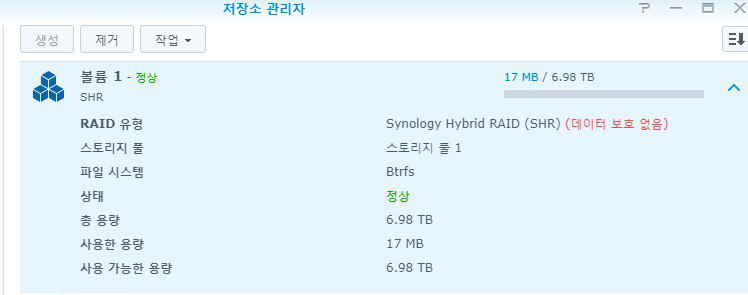 8TB 짜리 하드이지만, 일부 공간은 메타데이터 공간으로 써서 실제로 잡히는 건 6.98TB. 추후에 하나 더 확장해서 TB 듀얼로 구성할 예정입니다. 백업도 잘 해야 하니까요.