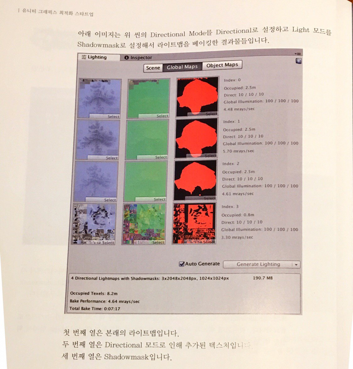 두 번째 세 번째 열은 Directional, Shadowmask 모드로 인해 추가된 텍스처. 하단의 총 용량이 190.7MB 피씨나 콘솔에서는 문제 되지 않지만, 모바일에선 메모리 문제를 일으킬 수 있는 수치.