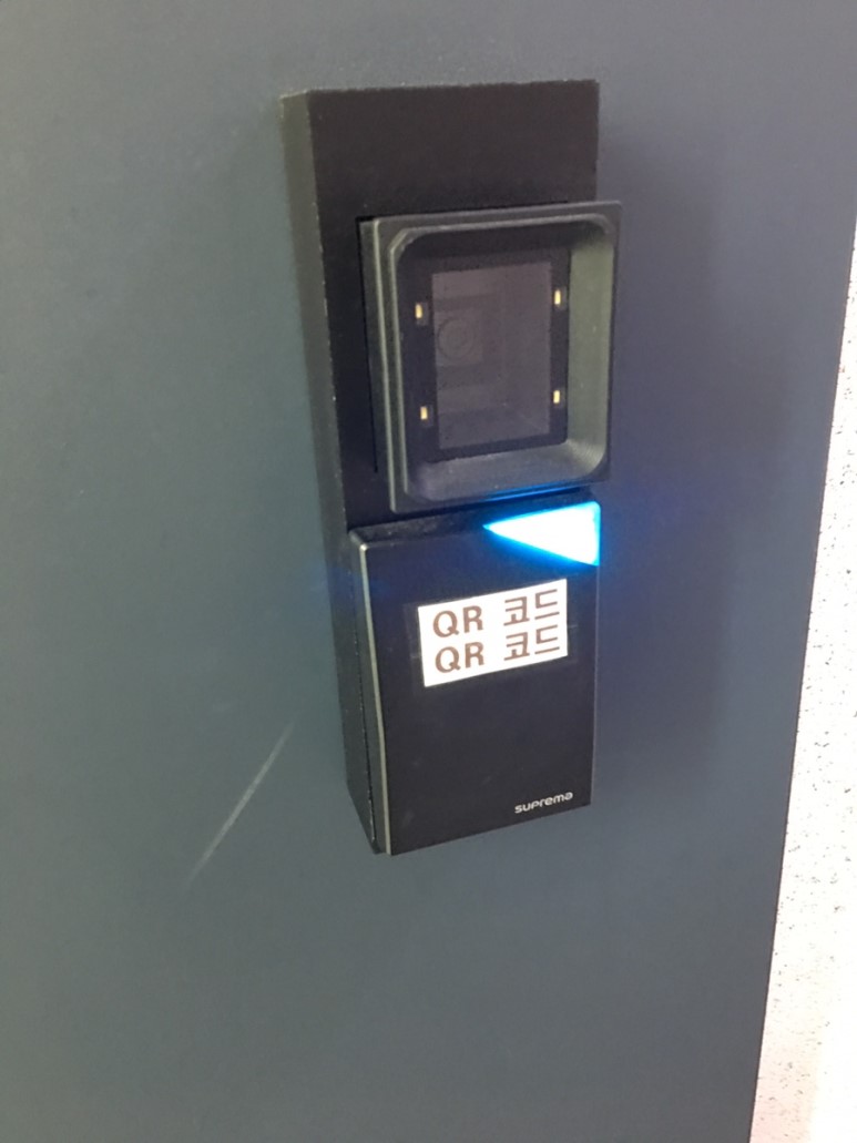 왼쪽처럼 QR코드가 나오는데, 이걸 우측 리더기에 읽히면 문이 열립니다. 문자로도 QR코드를 볼 수 있는 링크를 보내줘서 종이 분실해도 문제 노노.