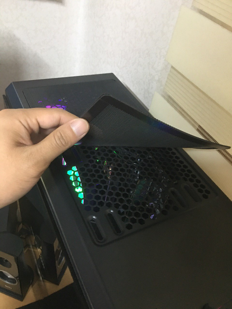 또 상판부도 뜨거운 공기를 배출하기 위해 뚫려있는데, 이렇게 자석으로 필터를 올려둔 모습입니다. 번들팬을 별도 구입해서 상단부에 2개 추가 설치도 가능합니다.