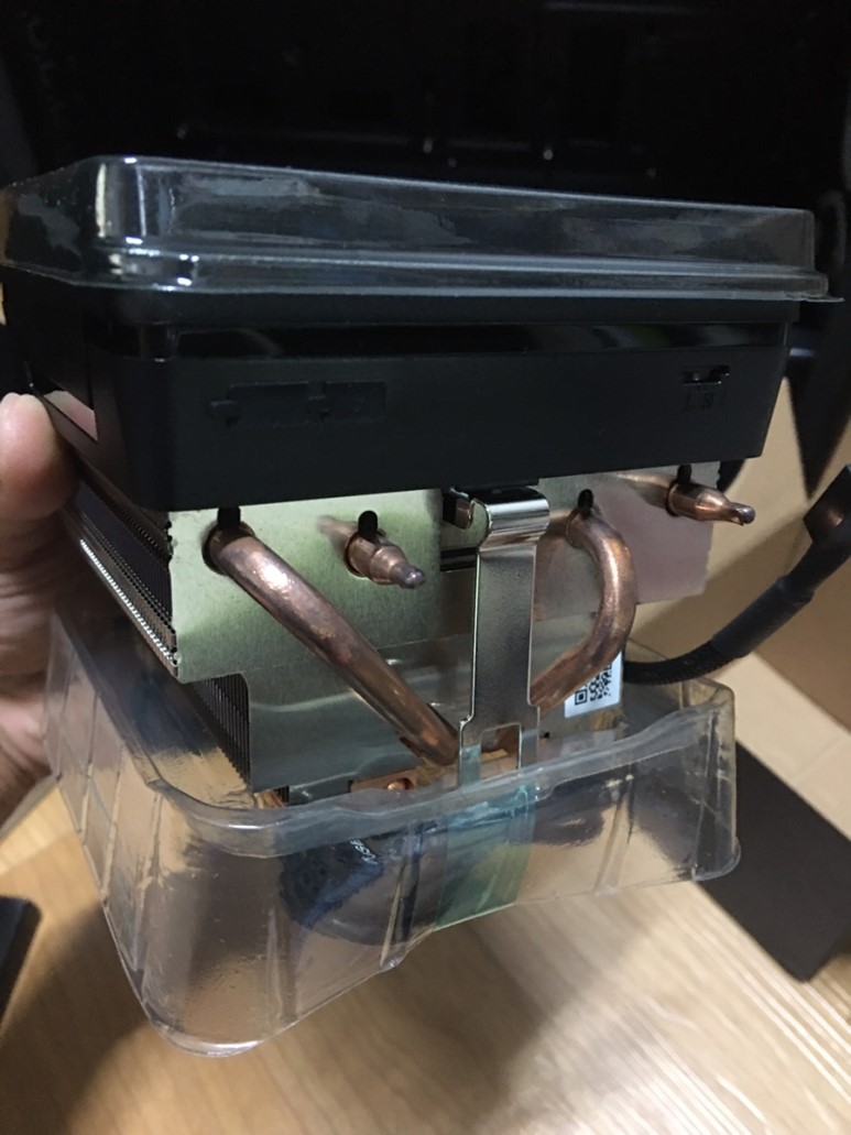 쿨러까지 장착을 마친 모습. 히팅파이프가 4열이 들어있어서 기존 쿨러보단 쿨링효율이 더 좋아보이긴 합니다. 기본옵션으로는 기본쿨러로도 충분하다고 하니, 쿨러 욕심 부리지 말고 오래 써봐야겠습니다.