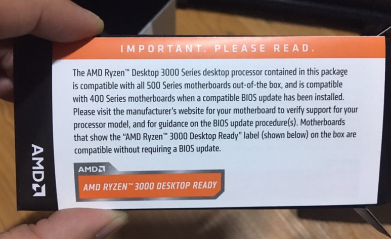 작은 CPU 박스를 열면 이런 "중요 카드"가 나옵니다. Ryzen 3000 대 시리즈는 500대 이상의 보드와 호환되고, 400대 보드에서는 호환 BIOS 업데이트가 필요하다는 이야기입니다.