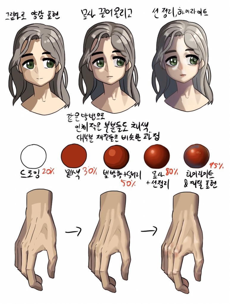 드로잉, 밑색, 그림자+양감, 묘사 선정리, 하이라이트 반사광