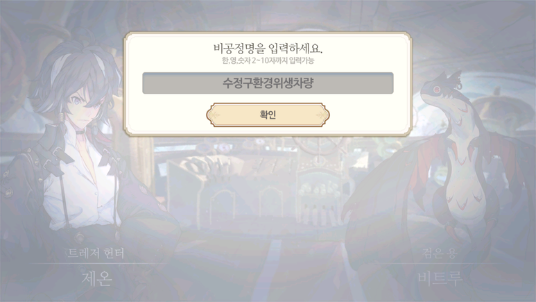 비공정을 타고 모험한다는 컨셉이라 비공정 이름이 곧 계정이름이 됩니다. 컨셉에 충실한 게임이라는 점은 맘에 드네요. 저의 계정 이름은 "수정구환경위생차량"!
