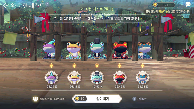 그리고 이런... 옛날 리니지의 개경주같은 개구리 레이스 컨텐츠가 있습니다. 인게임 토큰을 소비하는 것이긴 한데... 약간 도박성 컨텐츠 느낌이 들지만 이정도는 심의에 괜찮나보네요? 조금 놀란 부분.