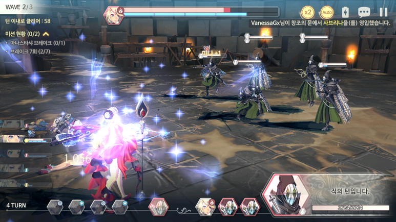 전투는 턴제로 이루어집니다. 하단에 각 캐릭터의 턴이 돌아오는 순서를 보여주는 UI 가 보이고 행동이 돌아오면 액션을 선택하는 식으로 진행됩니다.