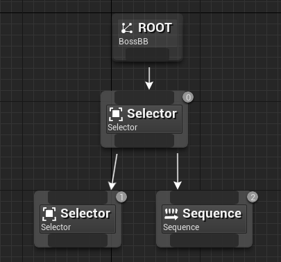 Selector Nodes : 비헤이비어 트리 흐름 제어에 사용. 여러 자식 노드를 셀렉터 노드에 연결 가능. 셀렉터 하나가 성공할 때까지 자식 노드 왼쪽부터 오른쪽 방향으로 실행. 성공/실패에 따른 비헤이비어 트리 생성. 모든 하위 노드가 실패하면 셀렉터 노드 자체가 실패.