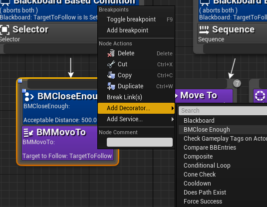 Decorator Nodes : 루트를 제외한 위 노드 타입들에 연결되며 실행 노드의 조건 검사 역할. ex) AI가 원하는 위치에 충분히 근접했는지 확인하는 데코레이터.