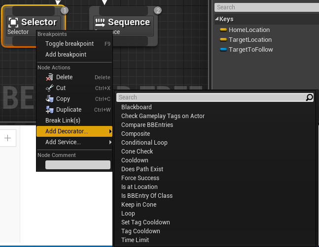 비헤이비어 트리 빈 영역을 우클릭하면 볼 수 있는 노드들의 목록. 우선 셀렉터 노드를 생성하고, 하위에 셀럭터 노드 1개, 시퀀스 노드 1개를 생성.