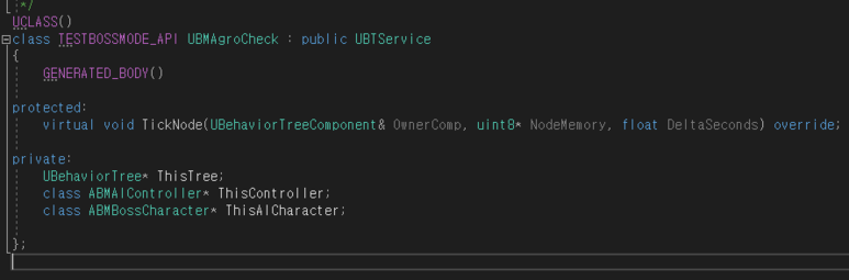 BTService 클래스를 상속받는 BMAgroCheck 클래스 생성. 주의, BTService_BlueprintBase 는 블루프린트용이니 무시.