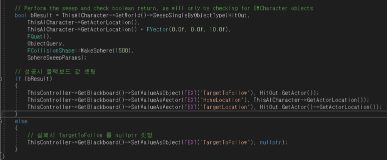 이번에도 블루프린트로 로직을 작성한다. Perform Condition Check 함수를 오버라이드 해서 시작. 반환 타입을 가지는 함수로 boolean 타입을 반환해야 함. TargetToFollow 블랙코드 키의 액터가 특정 범위 내에 있는지 체크하는 로직을 작성한다.