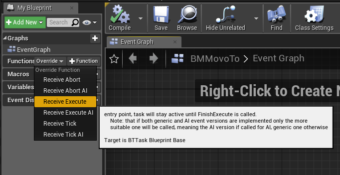 특정 함수를 Override 해서 시작점을 재정의할 수 있다. My Blueprint 탭의 Function 항목에서 Override Function 에 하위의 Receive Execute 함수를 선택. 부모 노드에 의해 태스크가 실행될 때 호출될 함수.