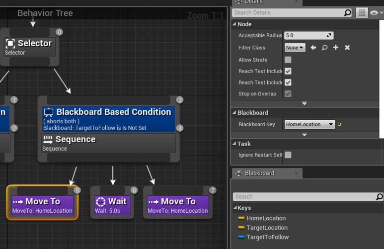 Task Nodes : AI가 수행하는 작업. 이동, 회전, 대기 등. Task Nodes 를 상속한 블루프린트/C++ 오브젝트로 새롭게 만들 수 있음.