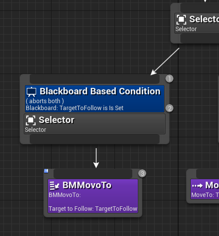 Selector Nodes : 비헤이비어 트리 흐름 제어에 사용. 여러 자식 노드를 셀렉터 노드에 연결 가능. 셀렉터 하나가 성공할 때까지 자식 노드 왼쪽부터 오른쪽 방향으로 실행. 성공/실패에 따른 비헤이비어 트리 생성. 모든 하위 노드가 실패하면 셀렉터 노드 자체가 실패.