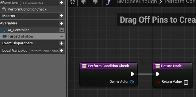 이번에도 블루프린트로 로직을 작성한다. Perform Condition Check 함수를 오버라이드 해서 시작. 반환 타입을 가지는 함수로 boolean 타입을 반환해야 함. TargetToFollow 블랙코드 키의 액터가 특정 범위 내에 있는지 체크하는 로직을 작성한다.