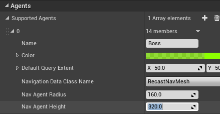 보스캐릭터 충돌 캡슐 크기 반경을 160으로 설정했으니, NavMesh 설정도 수정해줌.