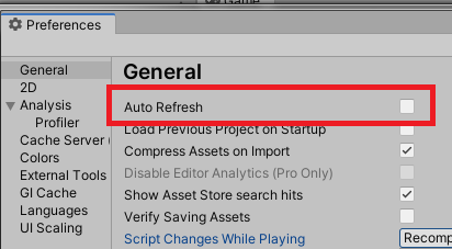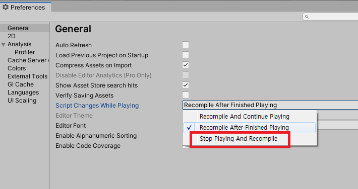 마찬가지로 Preferences 창에서 Script Changes While Playing 옵션을 변경해줍니다. 플레이 모드 중 스크립트가 변경됐을 때에 대한 설정입니다. 저는 Recompile After Finished Playing 으로 쓰고 있습니다. 코드가 변경됐을 때 Play 모드 중단을 원한다면 Stop Playing And Recompile 옵션으로.