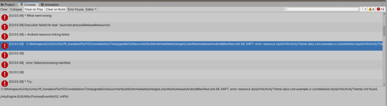 \UnityVR_Samples\Part10\Constellation\Temp\gradleOut\launcher\build\intermediates\merged_manifests\release\AndroidManifest.xml:36: AAPT: error: resource style/VrActivityTheme (aka com.example.vr.constellation:style/VrActivityTheme) not found.