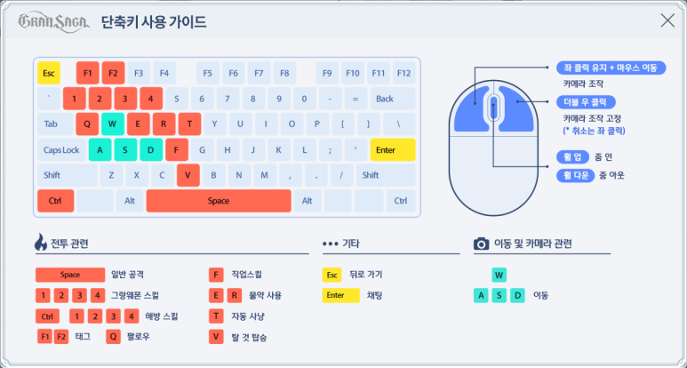 우측 하단에 단축키 가이드도 보이는군요. 스크랩 해두고 까묵으면 봐야겠네요. 물론 인게임에 들어가서도 메뉴에서 확인할 수 있습니다. 키가 많은 것 같지만, 보통 전투는 자동전투를 활용하면 되기 때문에 이동과 ESC + 마우스만 있으면 얼추 다 됩니다.