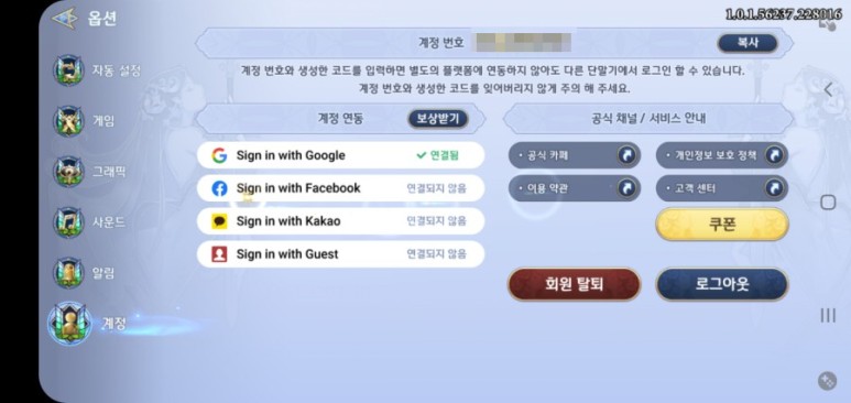 저는 구글 계정으로 연동을 해둔 상태입니다. 계정 데이터 보호를 위해 구글, 페북, 카카오 계정 중 하나로는 연동을 하시길 추천합니다. 보상도 받을 수 있으니까요.
