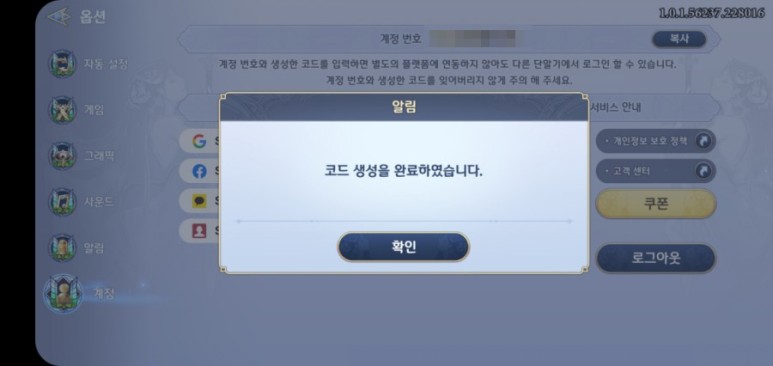 7. 모바일에서 복사한 계정 번호와 코드 입력