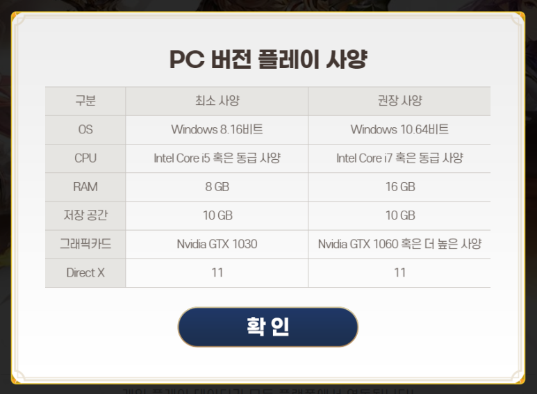 PC 버전 플레이 사양과 이쁜 설치파일.