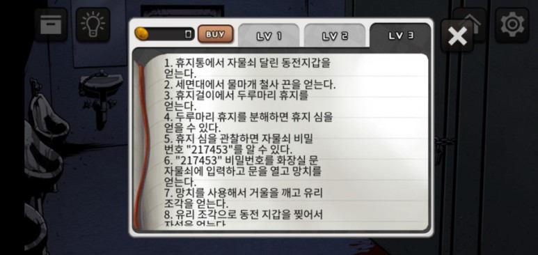 위 스샷처럼 Lv1 힌트를 열면 하나의 힌트만 보이고 Lv3 짜리 힌트를 열면 다양한 힌트를 보여줍니다. 거의 공략을 다 보여주네요. Lv2 힌트도 어중간 하기 때문에, 속 시원히 알고싶다면 7개를 써써 Lv3 힌트를 열어보라는 의도같습니다.